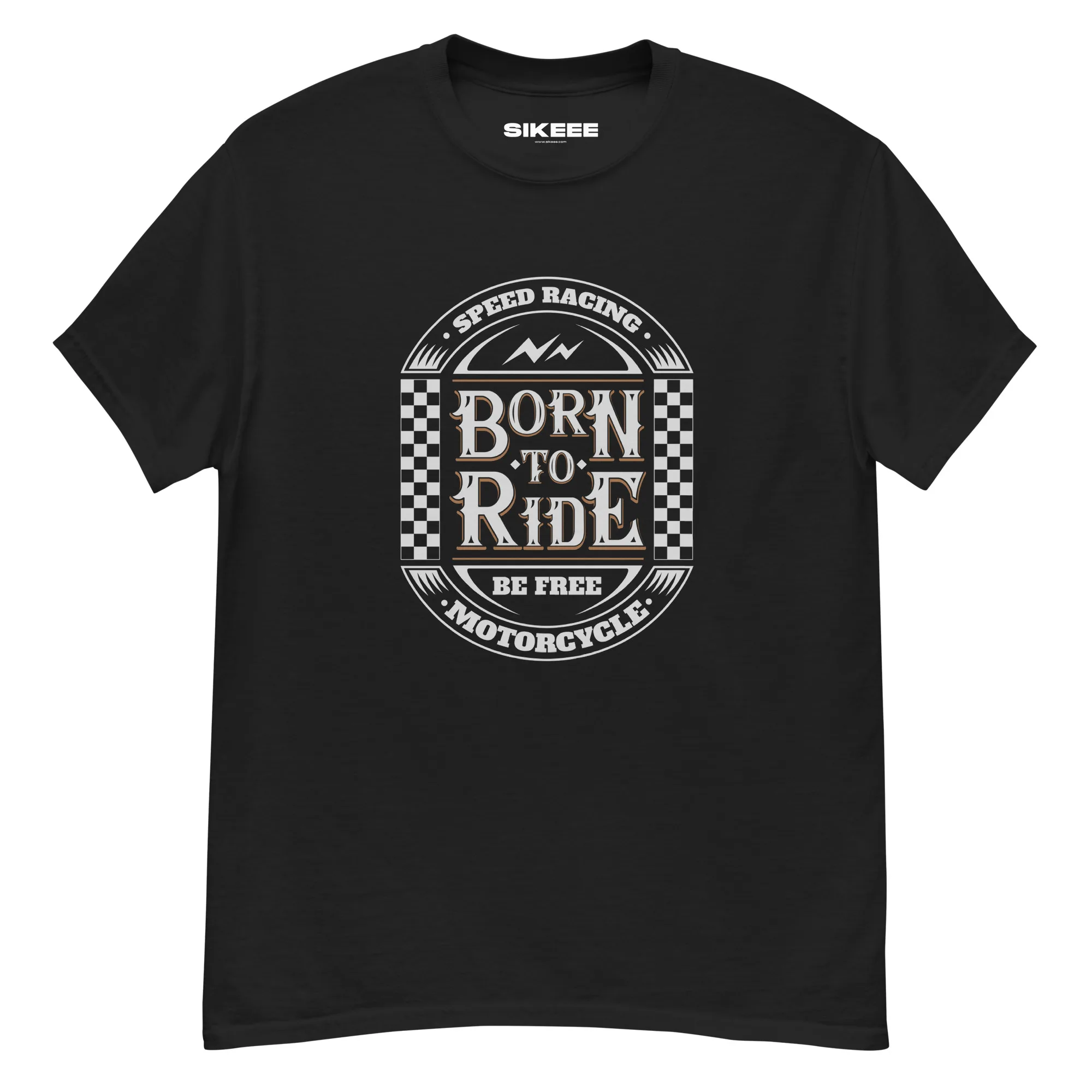 Design: Classic checkered racing theme with a bold “Born to Ride” slogan, perfect for bikers and thrill-seekers.